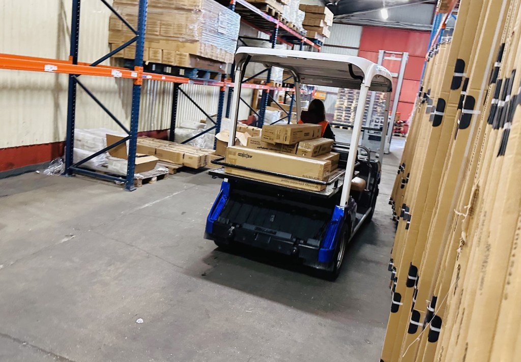 Una clásica operación de picking (recoger manualmente artículos en un almacén para preparar un pedido) se hace con una transpaleta jalada por una persona caminando. Con un vehículo utilitario con tolva, puede llevar igual o más artículos, con las ventajas de utilizar menos tiempo y poder realizar mayores recorridos ya que el factor fatiga queda eliminado.
